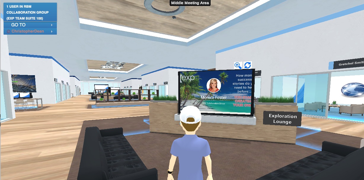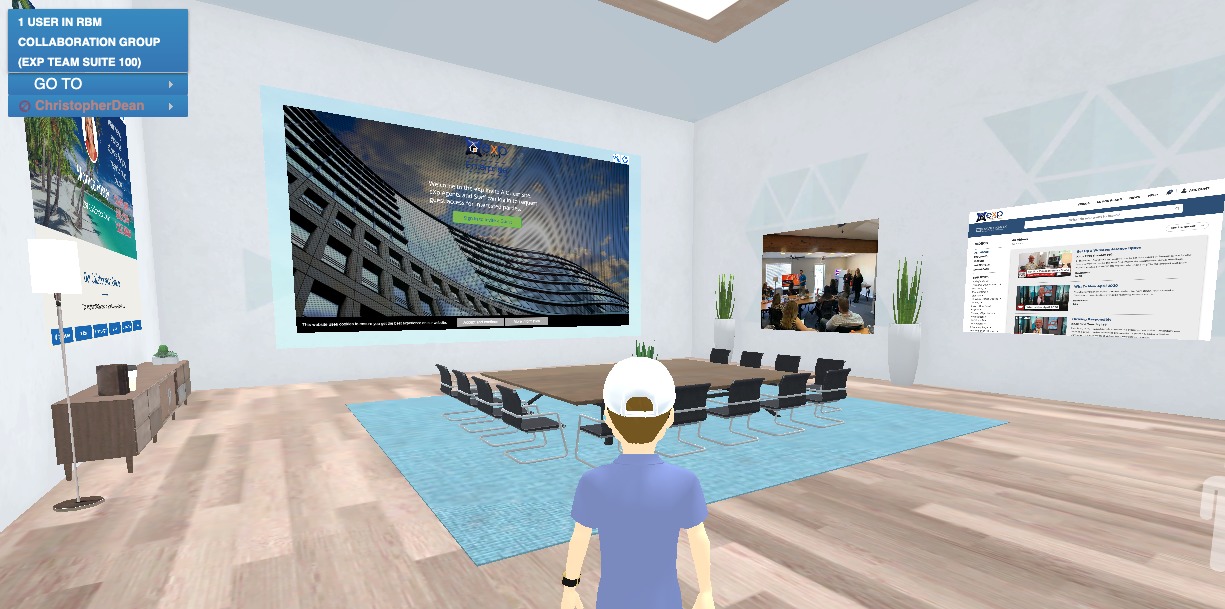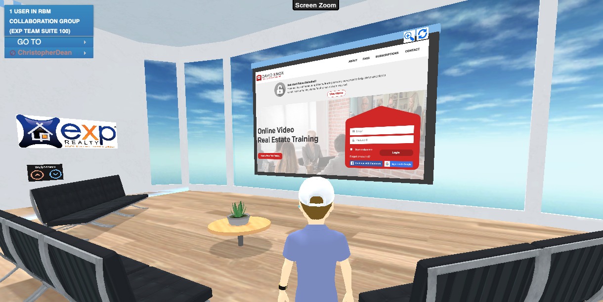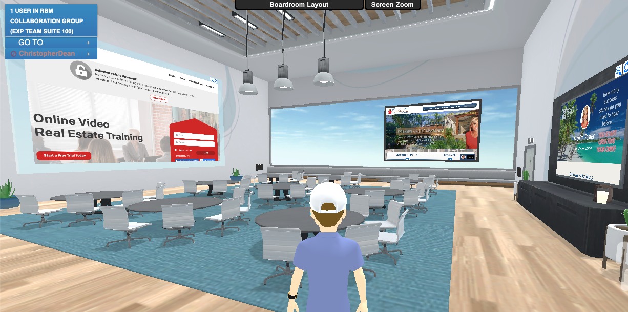 eXp World provides plenty of places to have meetings with your team, downline, other agent prospects and even clients. Any web screen can be used to browse the web, give a presentation, or share your screen. Some larger venues are available for rent.